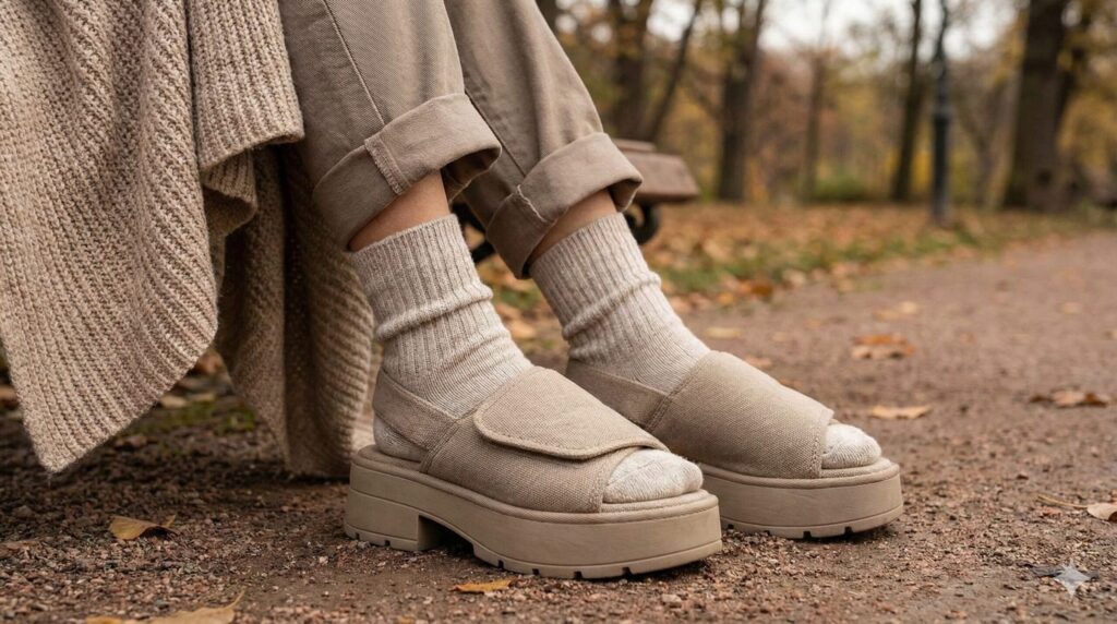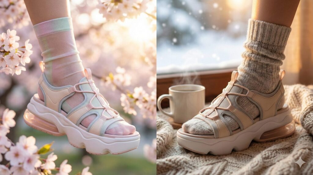 「冬にサンダルは寒そうに見えるのでは?」という懸念については、素材で季節感を出すことで解決できます。モヘア混のふわふわした靴下や、暖色系のカラーを選ぶことで、視覚的にも「冬の装い」として成立します。もう一度言いますが、ココは4シーズン履ける「全天候型ファッションアイテム」なのです。
