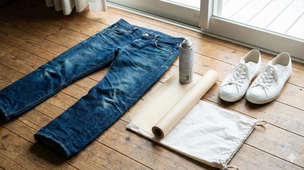 ただし、デニム全体にスプレーしてしまうと、本来の経年変化(アタリやヒゲ)が出にくくなるデメリットがあります。変化を楽しみたい部分は残し、スニーカーと接触する裾の裏側だけをピンポイントで保護するのが、愛好家としての賢い妥協案です。