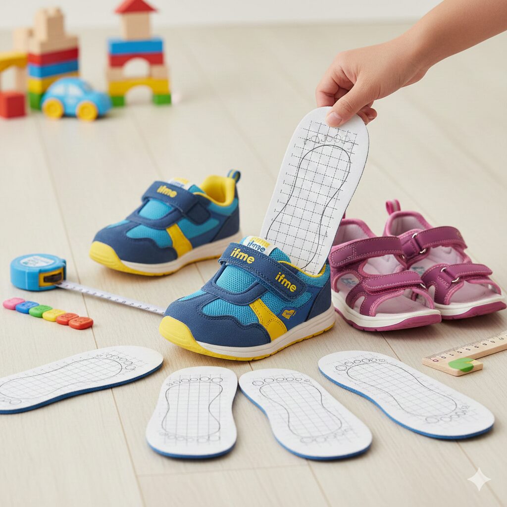イフミーの靴は、早稲田大学スポーツ科学学術院との共同開発によって生まれた「足育(あしいく)」の結晶です。親御さんが最も心配される「サイズ選び」の不安を解消するため、イフミーは全てのモデルで取り外し可能なインソールを採用しています。