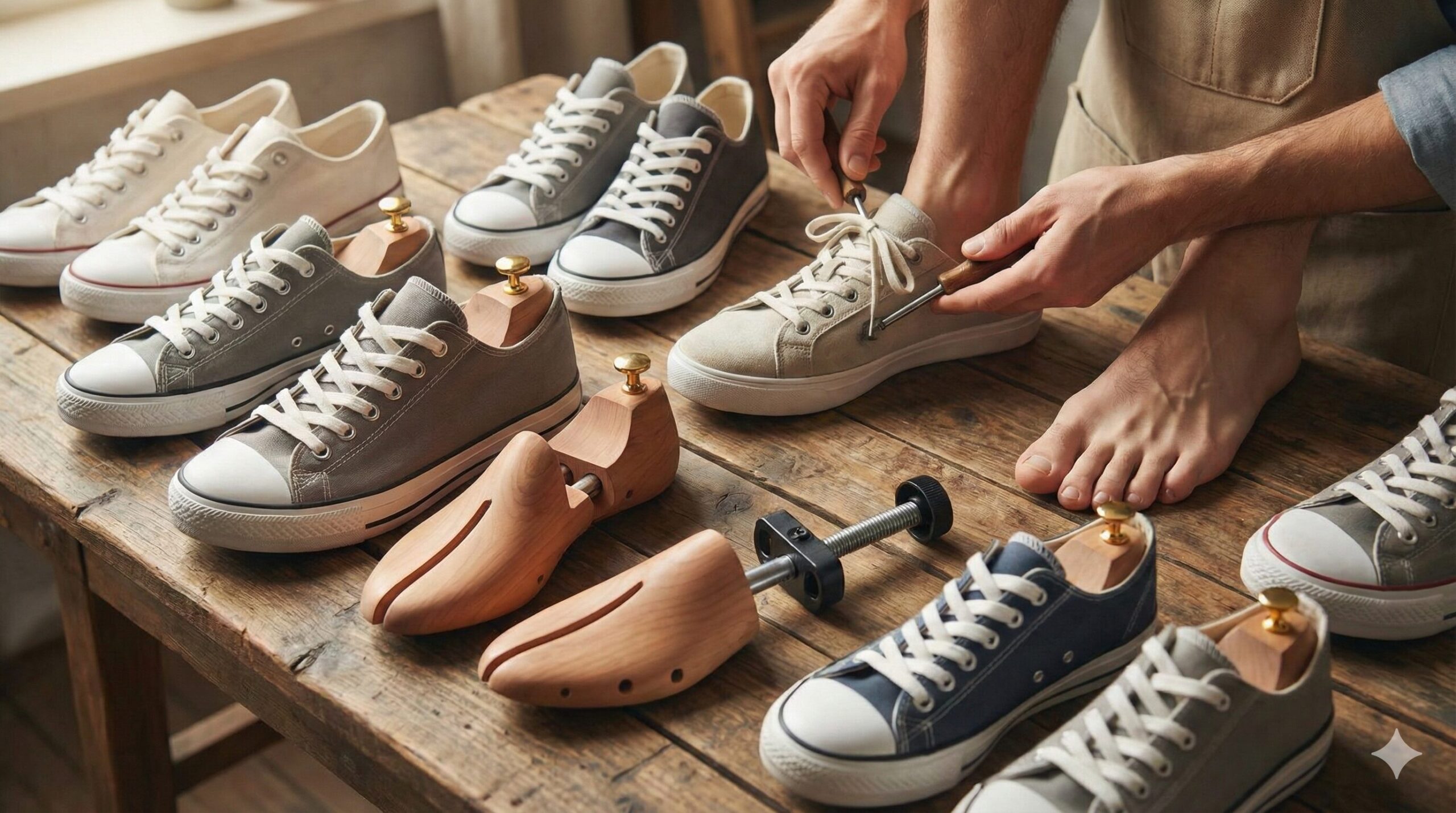 レザーのコルテッツであれば、つま先から中足部にかけてのラインをストレッチャーで平行に押し広げることで、クラシックなシルエットを保ちつつ快適な幅を確保できます。無理に広げすぎるとソールとの接着面に負荷がかかるため、少しずつ段階を踏んで広げるのが愛好家流の嗜みです。