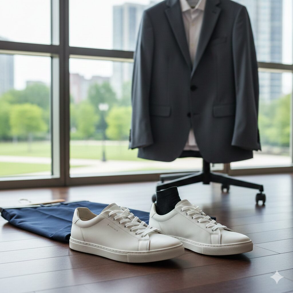 経済産業省が「歩く」ことを推奨する健康経営を後押ししている背景もあり、スーツ×スニーカーはもはや新しいスタンダードです。ただし、単に「楽だから」という理由で手持ちの運動靴を合わせるのは危険です。