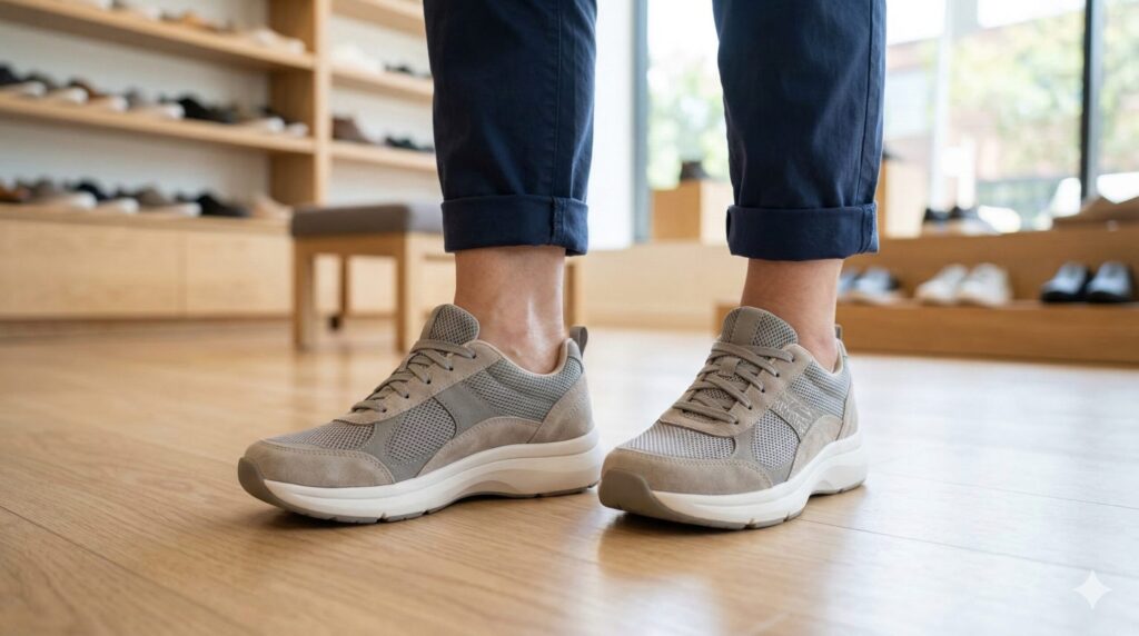 その状態でつま先に1cm程度の余裕があり、親指の付け根に不快な圧迫感がないかを確認します。もし4Eで幅は良いけれど踵が脱げるという場合は、靴紐の通し方を「ヒールロック」にするだけで、驚くほどフィット感が向上し、外反母趾の痛みから解放されることがあります。