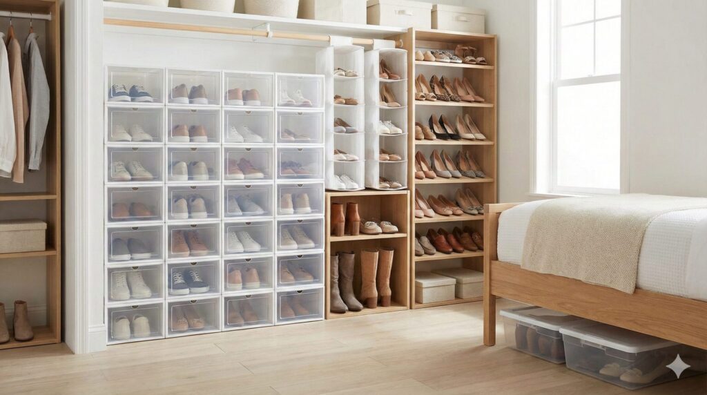 靴の箱を潔く処分した後は、通気性が良く、中身が瞬時に判別できる収納環境を整えることが、靴の寿命を延ばす鍵となります。愛好家として、機能面での妥協は一切なし。紙箱の弱点(湿気・視認性の悪さ)を完璧にカバーする、厳選した10個の解決策をご覧ください。