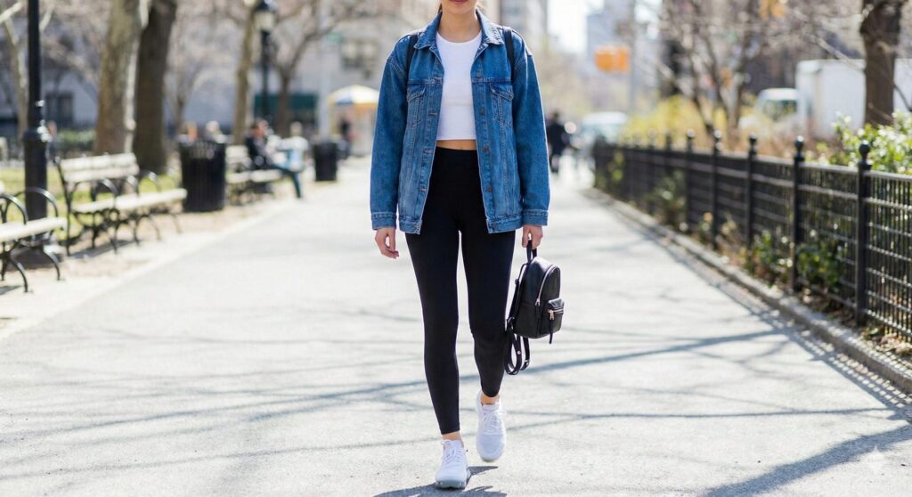 - 上下のバランス: タイトなレギンスに対して、トップスにボリュームのあるデニムジャケットを羽織ることで、下半身を華奢に見せるスタイルアップ効果が期待できます。