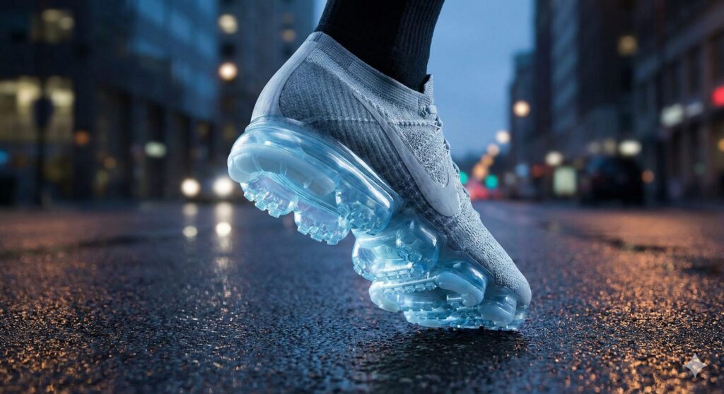 ヴェイパーマックスが一部で「ダサい」と評される最大の理由は、その剥き出しのエアユニットが放つ「異質感」にあります。一般的なスニーカーはミッドソールというクッション材でエアを覆い隠しますが、このモデルは足裏全体が独立したエアの塊のみで構成されています。この革新的な見た目が、見慣れない人には「生き物の足のよう」「やりすぎたハイテク感」として映ってしまうのです。